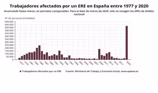 De los 830.643 trabajadores afectados por regulaciones de empleo hasta abril, el 99,5% (826.393 trabajadores) estaban en procedimientos de suspensión de contrato o reducción de jornada y sólo el 0,5% fueron objeto de un despido colectivo (4.250 trabajadores). Los primeros se han multiplicado por casi 36 respecto al mismo periodo de 2919, mientras que los segundos se han reducido un 44,6%.