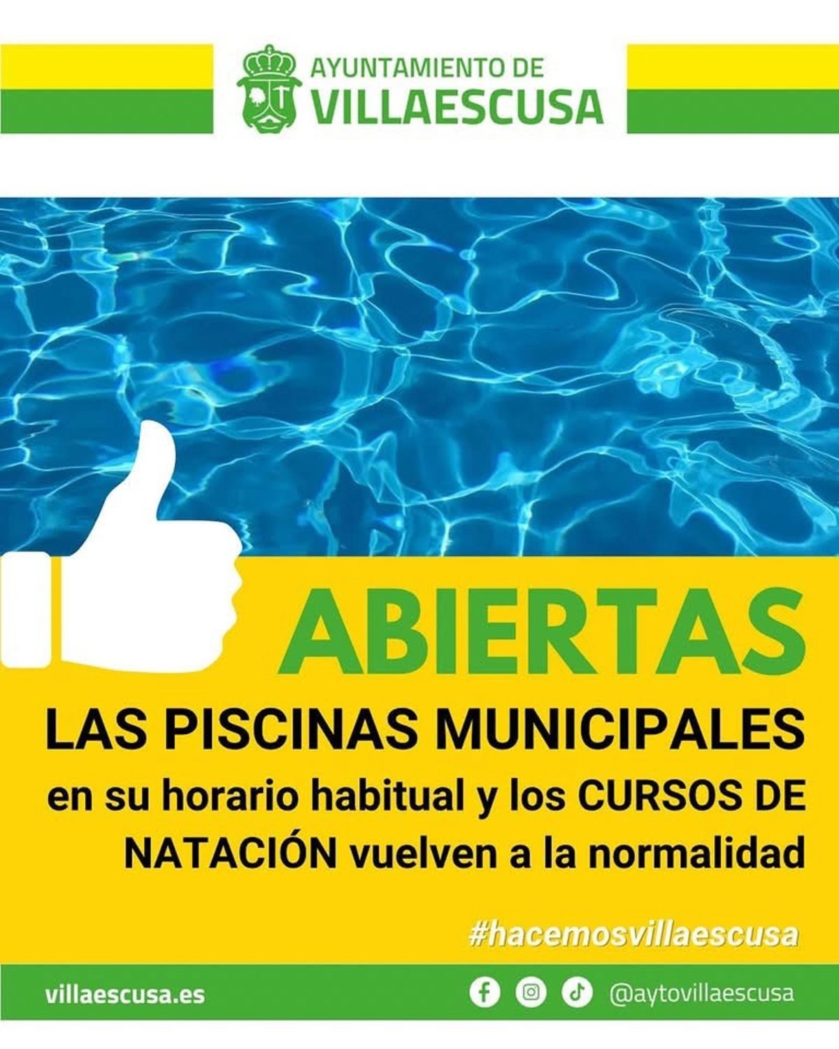 Cartel del Ayuntamiento de Villaescusa en sus redes sociales informando de la reapertura de la piscina tras haberse tenido que cerrar por la presencia de excrementos en el agua - AYUNTAMIENTO DE VILLAESCUSA