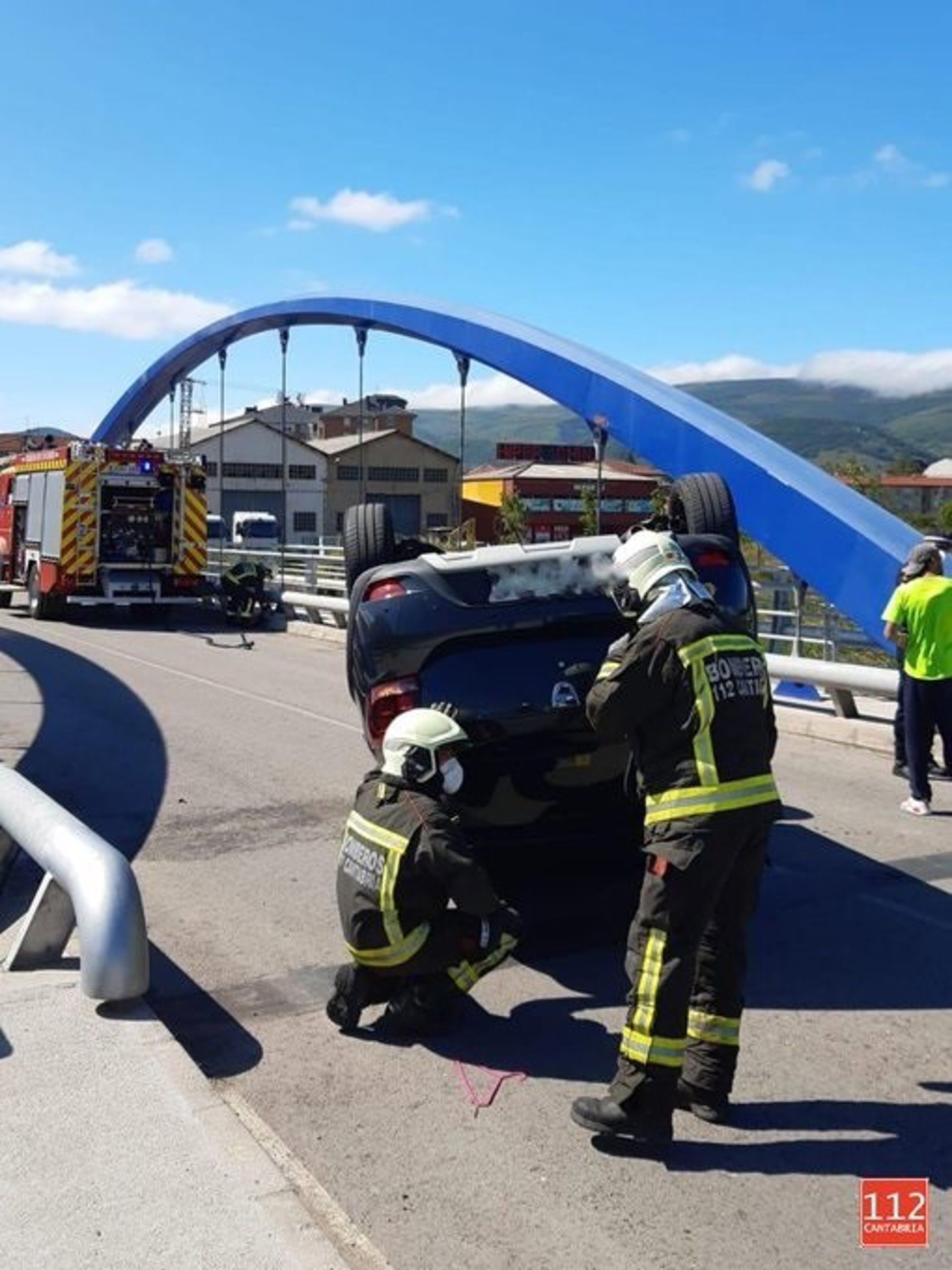 Un coche se sale de la vía este viernes en Reinosa y ha quedado volcado sobre la calzada pero sus ocupantes han logrado abandonar el habitáculo por sus propios medios.