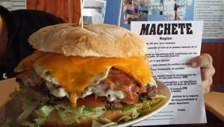 El 'Reto Machete' se trata de un concurso cuyo objetivo es comer una hamburguesa de dos kilos en menos de 45 minutos, al estilo del programa de televisión 'Crónicas carnívoras'.
