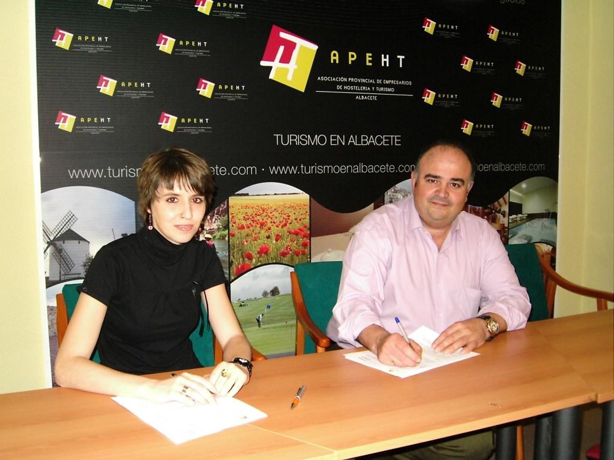 El presidente de la Asociación Provincial de Empresarios de Hostelería y Turismo (APEHT), Juan Sánchez, y la gerente de Consultoría Innova, Dori López Nieves, en representación del portal de comercialización en Internet de "Vive Albacete", han firmado un acuerdo de colaboración para aunar sus esfuerzos en el objetivo mutuo de mejorar el desarrollo y la competitividad del sector turístico en la provincia de Albacete.