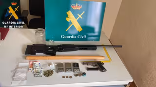 La Guardia Civil inspeccionó el lugar y descubrió una escopeta y una pistola de aire comprimido, esta última escondida en un falso techo, y un objeto contundente oculto en el hueco de un sofá. Igualmente se halló en un cajón cerrado 10 gramos de marihuana, 3 gramos de cocaína, dinero fraccionado, 3 básculas de precisión y dos paquetes con 30 bolsas de plástico para la venta de estupefacientes.