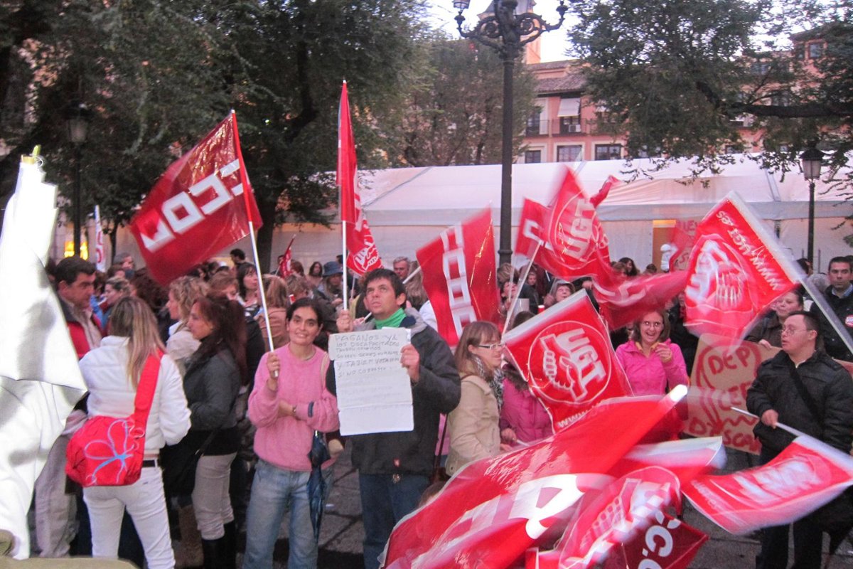 A la concentración, convocada por los sindicatos UGT y CCOO, han acudido asociaciones de discapacitados, que han exigido a la presidenta de la comunidad una solución: "Cospedal, paga ya", cantaban.