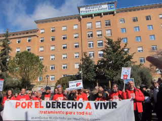 Con pancartas y camisetas de color rojo se han concentrado a las puertas del Hospital Virgen de la Salud de la ciudad, coreando lemas como 'Tratamiento para todos', 'No toleramos ni una muerte más' o 'No son muertes, son asesinatos'.