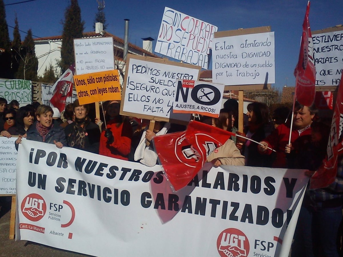Los trabajadores de la empresa Serclym, que prestan servicio de limpieza, cocina y recepción, mantenimiento y lavandería han reivindicado el pago de las nóminas de diciembre, paga extra de diciembre, la de enero y "el previsible impago de la nómina de febrero, por no tener expectativas de cobrar, ni respuesta alguna por parte de la empresa, que culpa de nuevo a la Administración regional del impago de las subvenciones", ha destacado la secretaria del Sector Sociosanitario de FSP UGT Albacete, Sonia Lorente.