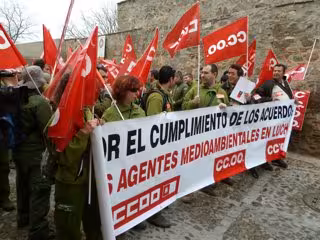 Los agentes se han concentrado, convocados por CCOO, bajo el lema 'Por el cumplimiento de los acuerdos, los agentes medioambientales en lucha' y durante la protesta se han podido escuchar lemas como "con este consejero nos quedamos sin empleo" o "menos asesores y más trabajadores".