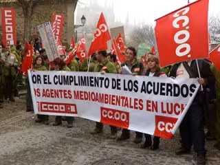 Los agentes se han concentrado, convocados por CCOO, bajo el lema 'Por el cumplimiento de los acuerdos, los agentes medioambientales en lucha' y durante la protesta se han podido escuchar lemas como "con este consejero nos quedamos sin empleo" o "menos asesores y más trabajadores".