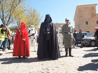 La legión ha tardado media hora en abrirse paso entre la gente que abarrotaba la plaza, sobre todo parejas jóvenes con hijos, muchos de ellos seguidores disfrazados de Darth Vader, los soldados imperiales, Chewbacca o la princesa Leia, que esperaban para hacerse fotos con los personajes en un photocall instalado en los arcos del Ayuntamiento y cuyos beneficios han ido destinados a la asociación APACU.