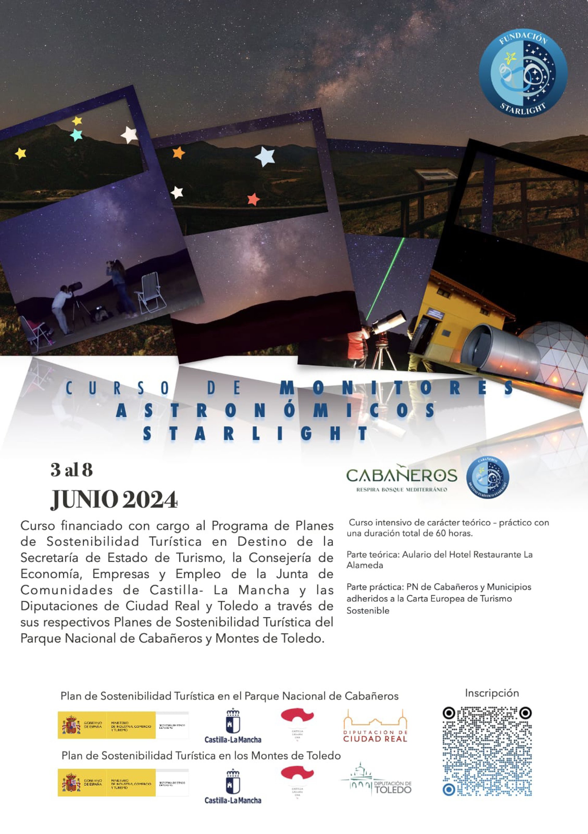 Las diputaciones de Toledo y Ciudad Real colaboran en la organización y celebración de un Curso Oficial de Monitores Starlight que se va a realizar en Navahermosa, entre el 3 y el 8 de junio, en el marco de las actuaciones del Plan de Sostenibilidad Turística Montes de Toledo y el Plan de Sostenibilidad Turística Parque Nacional de Cabañeros respectivamente, en el que el Turismo de Estrellas ocupa un lugar muy destacado. La fecha de inscripción estará abierta hasta el próximo lunes, 13 de mayo.