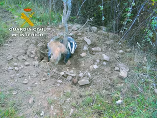 En la investigación, agentes de la Guardia Civil descubrieron a este ejemplar de tejón atrapado en un lazo sujeto a un árbol, ha informado la Delegación del Gobierno en nota de prensa.