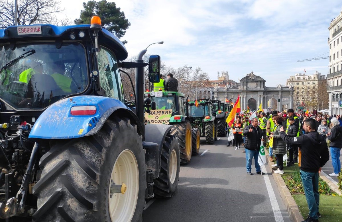 Unos 5.000 manifestantes esperaban en el entorno de la Puerta de Alcalá a los tractores que están llegando con retraso al centro de la capital, tras una marcha desde cinco columnas que han arrancado a primera hora de la mañana en Guadalajara y varios municipios de la región.