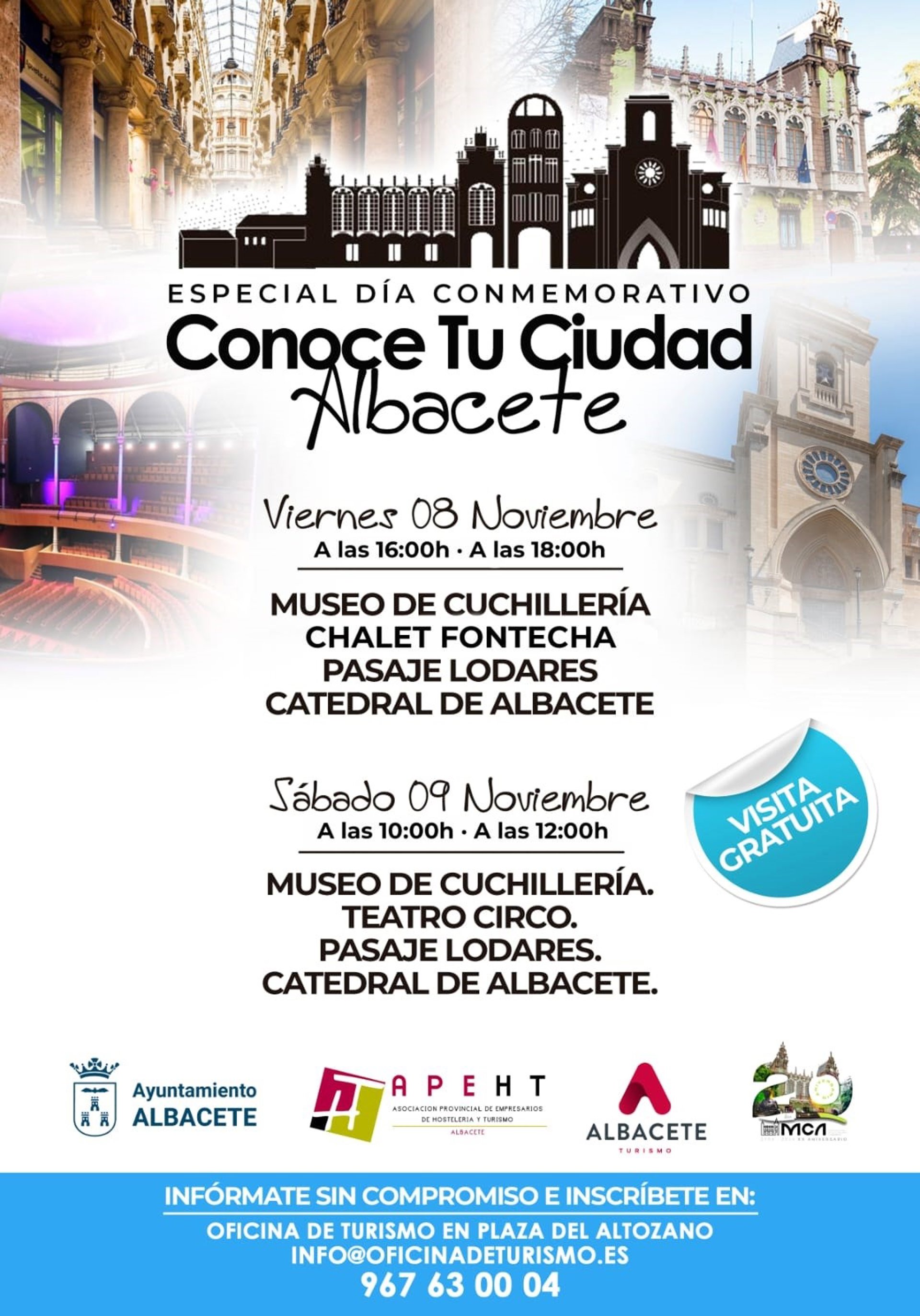 Begoña Garijo ha señalado que el día 8 de noviembre, a las 16.00 y 18.00 horas, se realizarán visitas guidas, al Museo de la Cuchillería, al Chalet Fontecha, al Pasaje Lodares y a la Catedral de Albacete, mientras que el 9 de noviembre, el Día de la Ciudad, tendrán lugar a las 10.00 y a las 12.00 horas por los mismos lugares excepto el Chalet Fontecha, ya que en su lugar se visitará el Teatro Circo de Albacete, deseando que esta acción sea todo un éxito para que se mantenga en el tiempo.