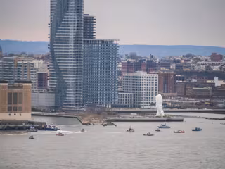 10 April 2025, US, New York: Rescue boats search for the downed tourist helicopter in the Hudson River off Jersey City. Six people died in the fatal crash. Photo: Milo Hess/ZUMA Press Wire/dpa - Milo Hess/ZUMA Press Wire/dpa