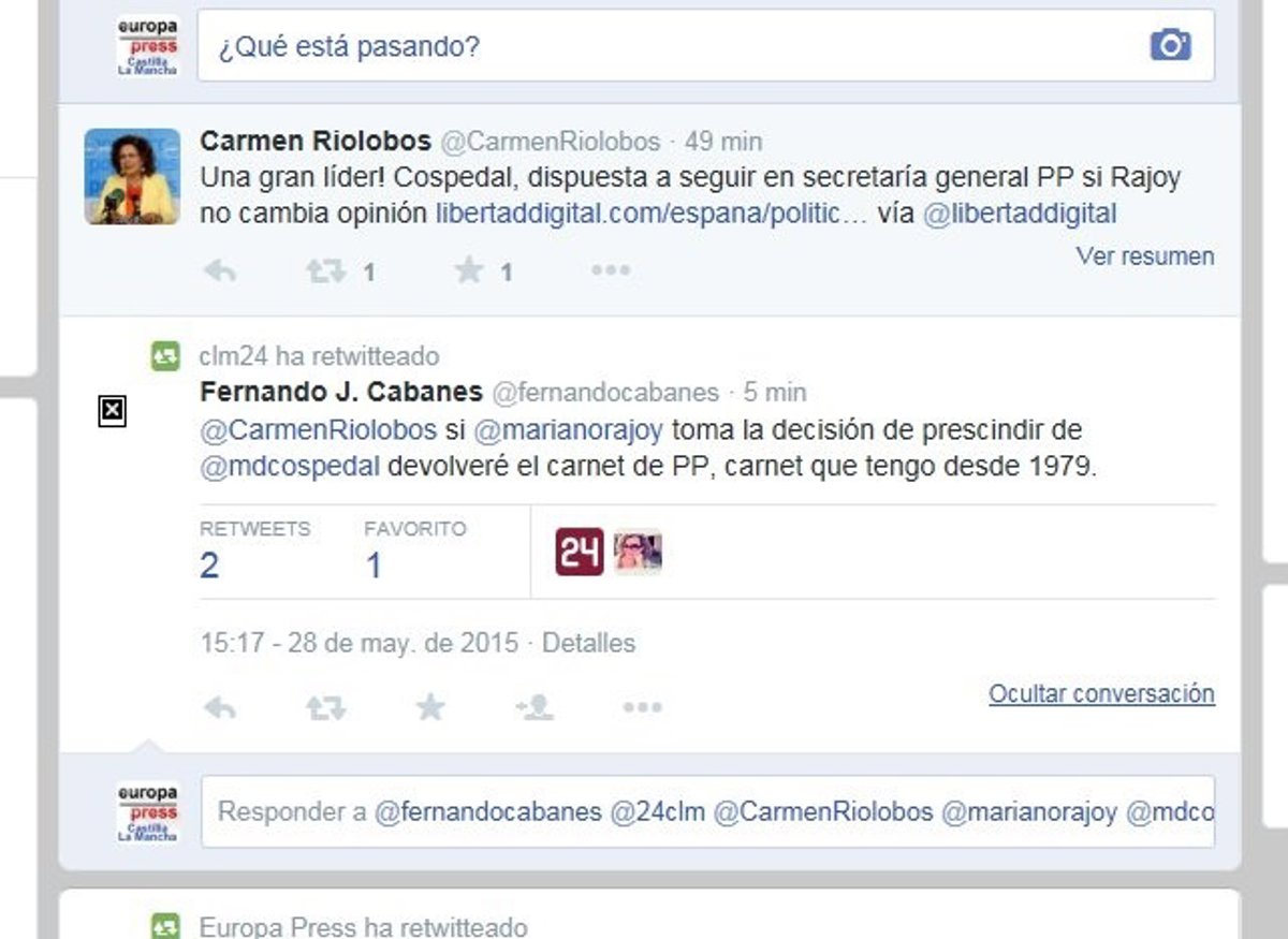 Asó lo ha manifestado Cabanes en su cuenta de Twitter, contestando a la portavoz del PP en Castilla-La Mancha, Carmen Riolobos, que ha lanzando un tweet desde su cuenta @CarmenRiolobos en el que ha afirmado: "Una gran líder! Cospedal, dispuesta a seguir en secretaría general PP si Rajoy no cambia opinión".