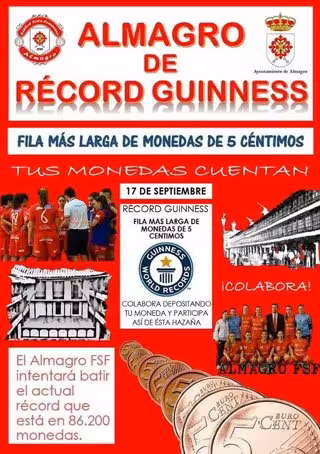El Almagro Fútbol Sala Femenino (FSF) (Ciudad Real) tirando de imaginación para conseguir un ingreso extra implicando a todos los almagreños, intentará este domingo, 17 de septiembre, batir el récord Guinnes de la fila más larga de monedas de 5 céntimos, que actualmente está en 86.150 monedas.