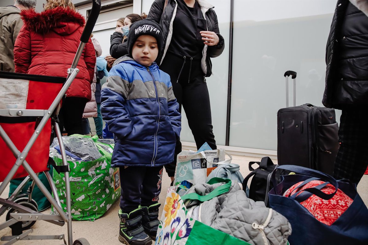 Un niño refugiado, junto al equipaje, a su llegada al Hospital Isabel Zendal, a 16 de marzo de 2022, en Madrid (España). Este grupo de personas ucranianas ha llegado a España gracias al convoy humanitario de la Fundación de La Asociación de Futbolistas - Carlos Luján - Europa Press