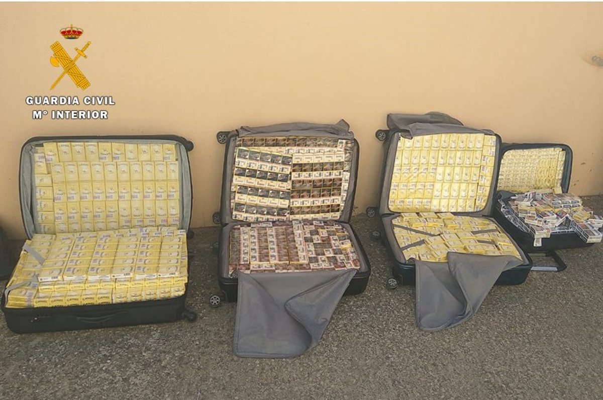 Tras la apertura de estas maletas, la Guardia Civil localizó en su interior 2.644 cajetillas de tabaco, de ellas 1.874 sin precinta de la Agencia Tributaria y otras 770 con precintas de países no pertenecientes a la Comunidad Económica Europea.