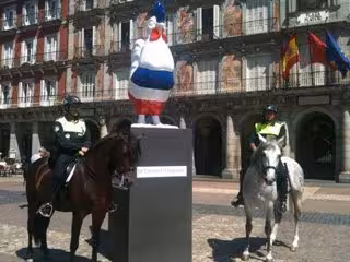 Una escultura de un gallo con los colores de la bandera francesa diseñado por el artista toledano dEmo ha sido instalada en la Plaza Mayor de Madrid con motivo de la Tercera edición de la feria Toute La France.