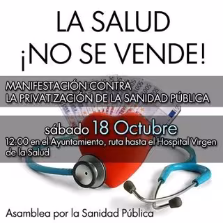 La Asamblea en Defensa de la Sanidad Pública ha convocado para el sábado 18 de octubre, una manifestación, que tendrá lugar a las 12.00 horas de la Plaza del Ayuntamiento al Hospital Virgen de la Salud, para denunciar la "inminente privatización del Hospital General de Toledo, precedido de un desmantelamiento de los servicios asistenciales del Complejo Hospitalario".