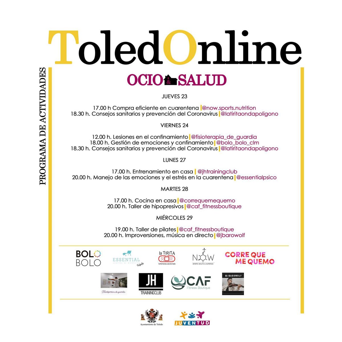 El programa 'ToledONline' regresará el lunes, día 27, con las propuestas 'Entrenamiento en casa' desde el perfil de Instagram @jhtrainingclub y 'Manejo de las emociones y el estrés en la cuarentena' desde @essentialpsico; mientras que el martes, día 28, las actividades previstas son: un taller de cocina en casa a las 17.00 horas desde @correquemequemo y un taller de hipopresivos a las 20.00 horas desde @caf_fitnessboutique.