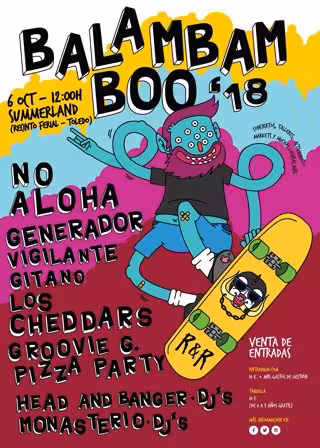 El sábado, 6 de octubre, volverá a Toledo una nueva edición del festival para todas las edades Balambam Boo, que este año contará con las actuaciones de los grupos musicales Los Cheddars, Vigilante Gitano, Generador, No Aloha y Groovie G. Pizza, a los que se unirán los dj's de la asociación Monasterio de Cultura y Head and Banger.