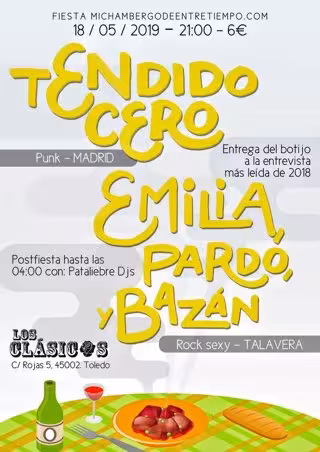 El blog dedicado a la música www.michambergodeentretiempo.com hará entrega del botijo de cerámica de Talavera de la Reina a la entrevista más leída de 2018 a la banda de punk madrileña Tendido Cero el próximo 18 de mayo en la Sala Los Clásicos de Toledo. El evento, que dará comienzo a las 21.00 horas, contará con las actuaciones de los talaveranos Emilia, Pardo y Bazán, Tendido Cero y cerrarán la velada Pataliebre Djs.