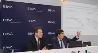 El economista jefe para España de BBVA Research, Miguel Cardoso, y el director Regional Centro Banca de Empresas y Corporaciones, Francisco Pla, en rueda de prensa - BBVA
