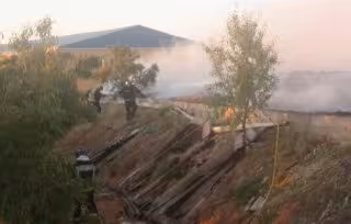 Las labores de extinción han obligado a desmontar en toda la nave las placas de fibrocemento para pagar el fuego. No obstante, debido a la complicación que supone la extinción de fuego en balas de paja, los bomberos han optado por permitir una combustión controlada de la misma.