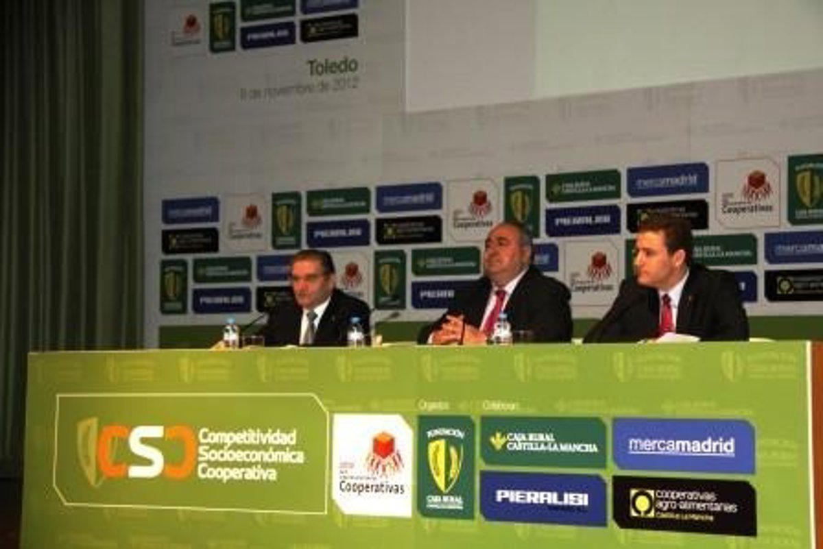 El presidente de Caja Rural Castilla-La Mancha y el director general de la entidad, Andrés Gómez Mora y Víctor Manuel Martín, respectivamente, destacaron este jueves, durante el acto inaugural de la Jornada 'Competitividad Socioeconómica Cooperativa', a la que asistió el presidente de las Cortes de Castilla-La Mancha, Vicente Tirado Ochoa, el ejemplo que está ofreciendo el cooperativismo como modelo de actuación frente a la crisis.
