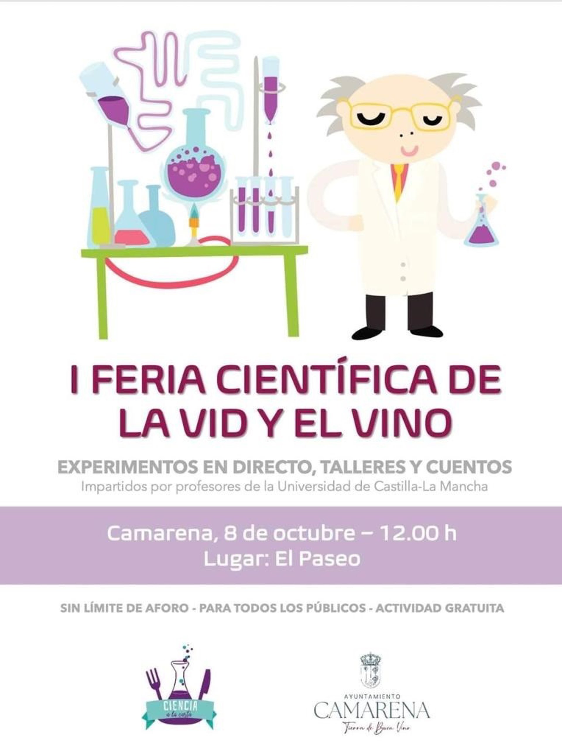 La asociación independiente para la divulgación del conocimiento científico Ciencia a la Carta y el Ayuntamiento de Camarena celebrarán el próximo sábado, 8 de octubre, la I Feria Científica de la Vid y el Vino, que tendrá lugar en El Paseo de la localidad toledana a partir de las 12.00 horas con una programación que incluye experimentos, talleres y cuentos sobre química, física, arqueología, microbiología o ingeniería, entre otras disciplinas, a cargo de personal científico e investigador de la Universidad de Castilla-La Mancha.