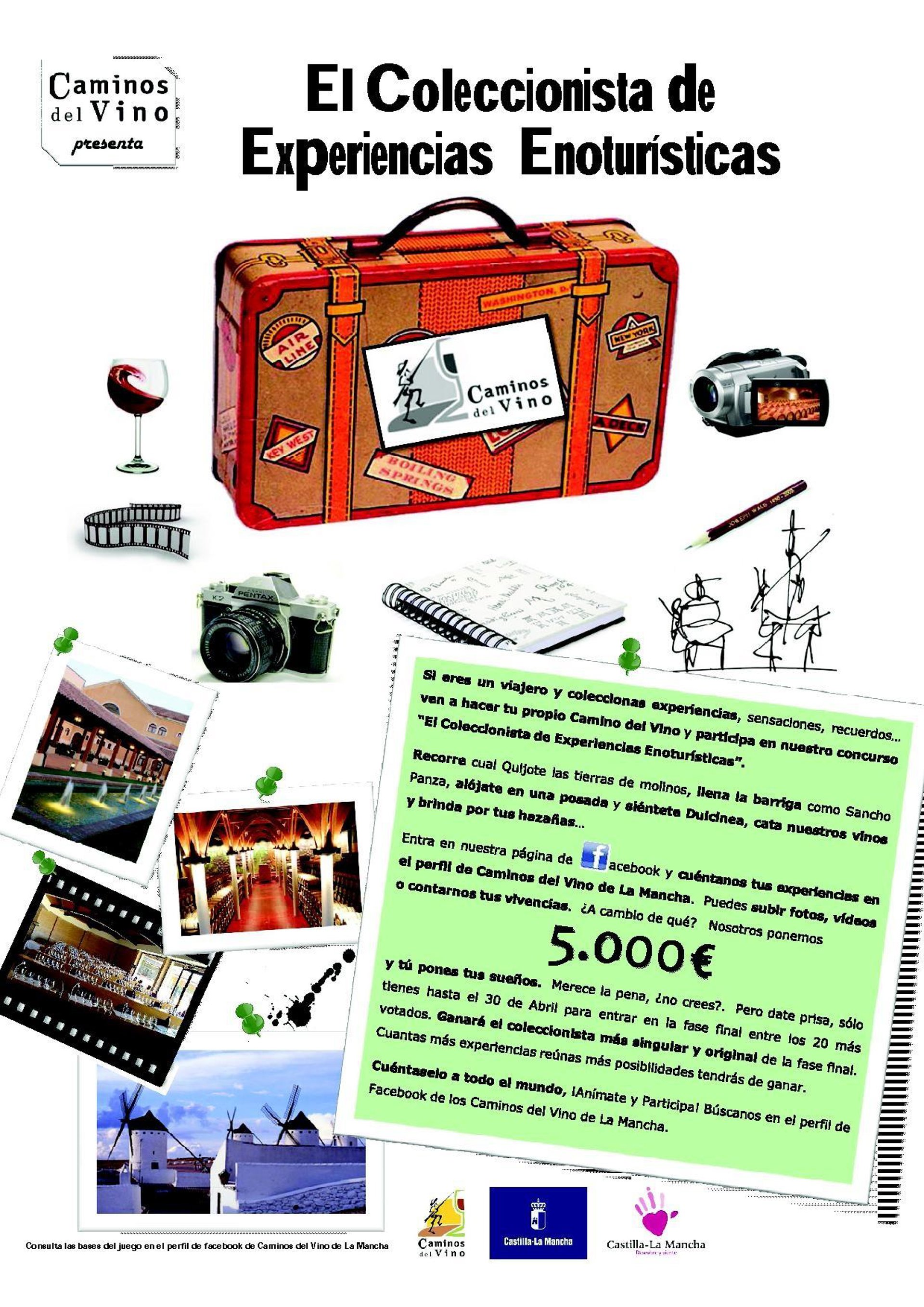 'Caminos del Vino de La Mancha', la ruta del vino que vertebra ocho pueblos que recorren la tierra del Quijote, ha lanzado una original iniciativa en Facebook: 'El Coleccionista de Experiencias Enoturísticas', dirigida a todos los asiduos a la red social a los que les guste viajar y que quieran ganar un premio a elegir por valor de 5.000 euros. Para concursar, los interesados deben entrar en el perfil de 'Caminos del Vino de La Mancha' y hacerse seguidores.