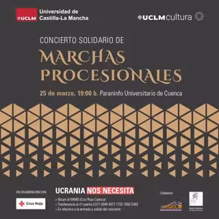 La Universidad de Castilla-La Mancha (UCLM) celebra este viernes 25 de marzo un concierto de marchas procesionales en el Paraninfo Universitario de Cuenca con fines solidarios para la población de Ucrania, que sufre las gravísimas consecuencias de la invasión por parte de Rusia.
