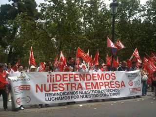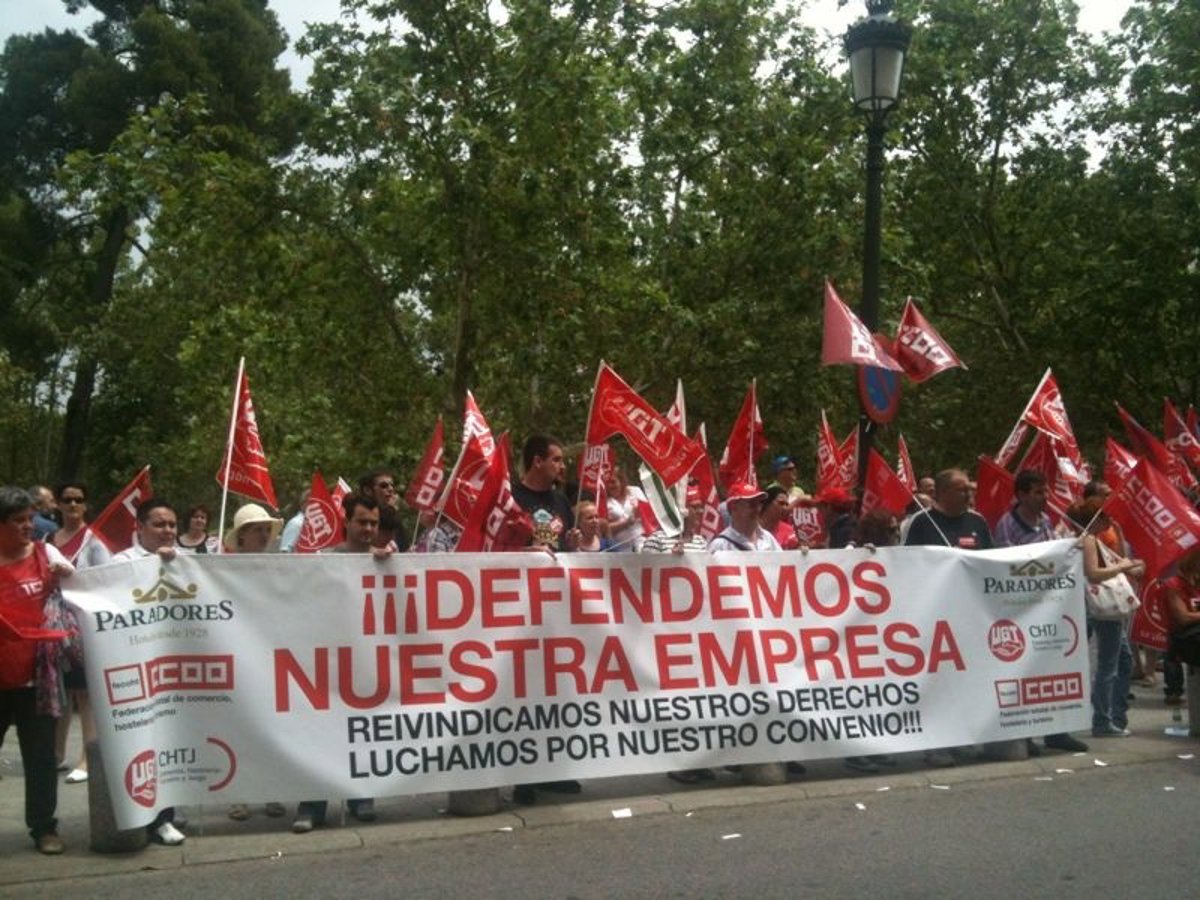 Portando una pancarta en la que podía leerse 'Defendemos nuestra empresa. Reivindicamos nuestros derechos, luchamos por nuestro convenio' y coreando "menos directores y más trabajadores" o "Paradores no se vende", empleados de la cadena pública, convocados por UGT y CC.OO., se han congregado a las puertas de las oficinas centrales de la cadena con la intención de entregar una carta a la presidenta de la cadena, Ángeles Alarcó.