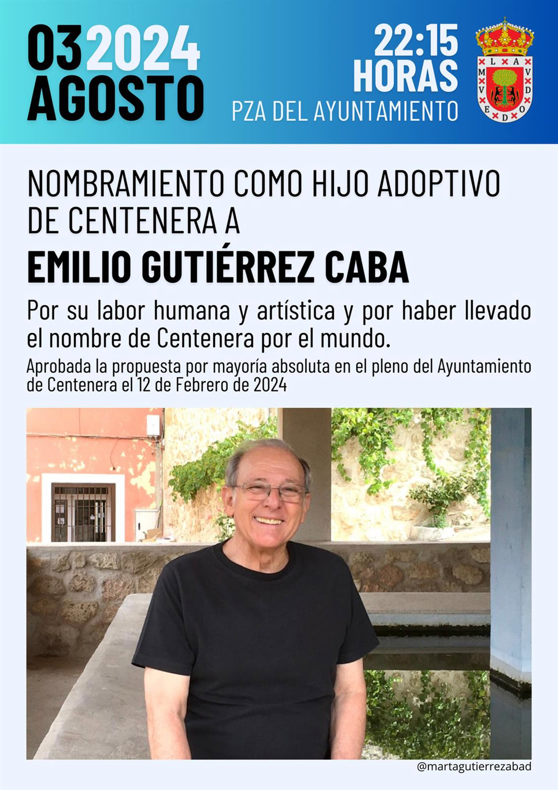 El próximo sábado, 3 de agosto, el actor Emilio Gutiérrez Caba será nombrado oficialmente Hijo Adoptivo del pueblo de Centenera (Guadalajara).