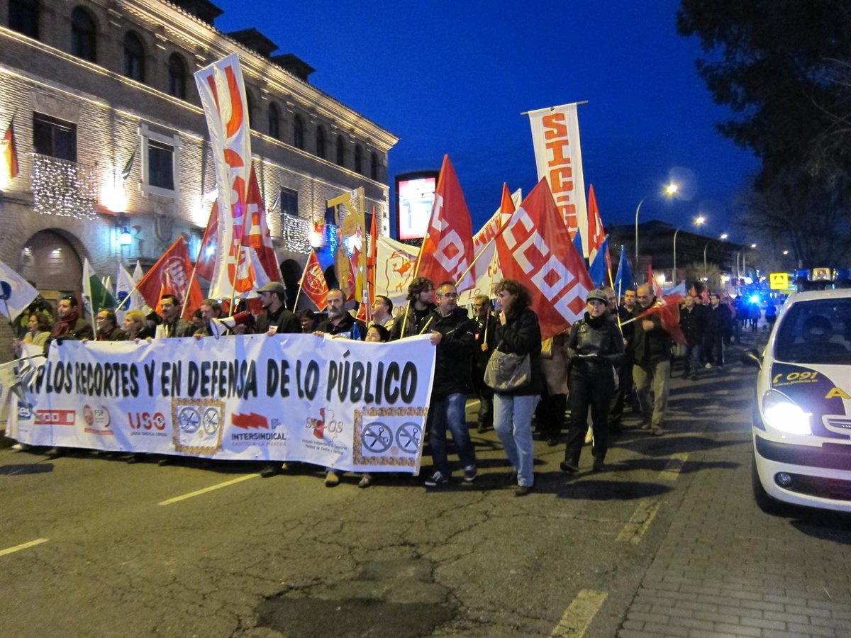 Tras la pancarta 'Contra los recortes, en defensa de lo público', y entre cánticos del tipo "Que se vaya 'la Cospe' de aquí a la Comunidad de Madrid" o "Contra el paro, lucha obrera", en una marcha que ha transcurrido de forma pacífica desde la Plaza de Toros hasta la Plaza de Zocodover los manifestantes toledanos han expresado su rechazado.