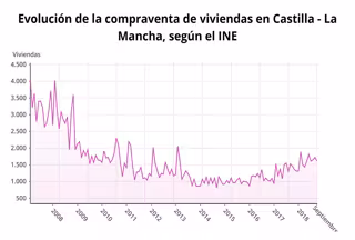 Por tipo de vivienda, las transacciones sobre viviendas nuevas evolucionaron en Castilla-La Mancha un 30,96. Mientras, la compraventa de viviendas libres varió un 8,55% en septiembre de 2018 en tasa interanual, hasta sumar 1.486 transacciones, en tanto que las operaciones sobre viviendas protegidas experimentaron un cambio de 36,26%, con 124 transacciones.