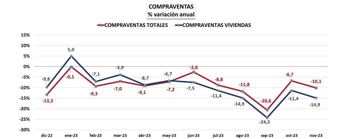 Es a partir de este mes cuando se intensificaron los descensos, alcanzando en septiembre la mayor caída del periodo analizado (-20,6%). En noviembre de 2023 continúa la caída, en línea con otros meses anteriores: las compraventas totales descendieron el 10,1%, mientras que las de vivienda lo hicieron de forma más intensa, el 14,9%.