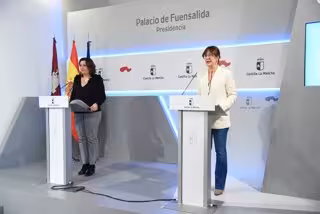 La portavoz del Gobierno de C-LM, Blanca Fernández, y la consejera de Economía, Empresas y Empleo, Patricia Franco, en rueda de prensa - JCCM