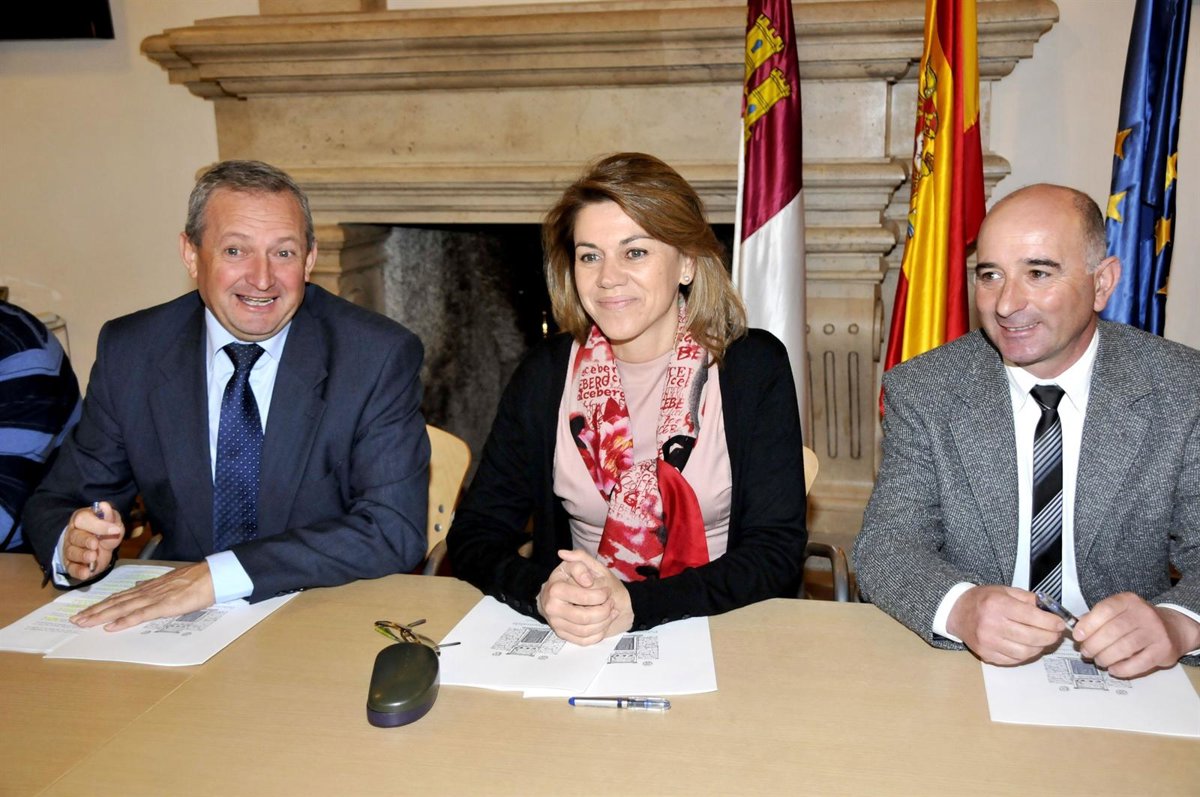 La presidenta de Castilla-La Mancha, María Dolores de Cospedal, junto con la consejera de Agricultura, María Luisa Soriano, han mantenido un encuentro en el Palacio de Fuensalida de Toledo con el presidente del Consejo Rector de Cooperativas Agro-Alimentarias, Ángel Villafranca.