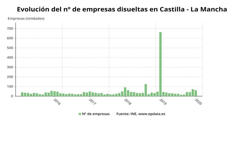 El número de nuevas sociedades mercantiles cayó en Castilla-La Mancha un 11,7% en enero respecto al mismo mes de 2019, hasta sumar 235 empresas, al tiempo que las disoluciones empresariales se desplomaron un 90,6%, hasta totalizar 62, según los datos difundidos este jueves por el Instituto Nacional de Estadística (INE).
