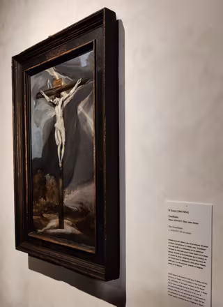 El Greco desarrolló entre 1571 y 1577 distintas versiones sobre el tema de la crucifixión, teniendo todas ellas como elemento central un Cristo en la cruz basado en un diseño de Miguel Ángel. La nueva adquisición es, probablemente, la más tardía de esas variantes y la culminación de todas ellas, datable entre los últimos años de la estancia del pintor en Roma y los primeros tiempos del artista en Toledo.