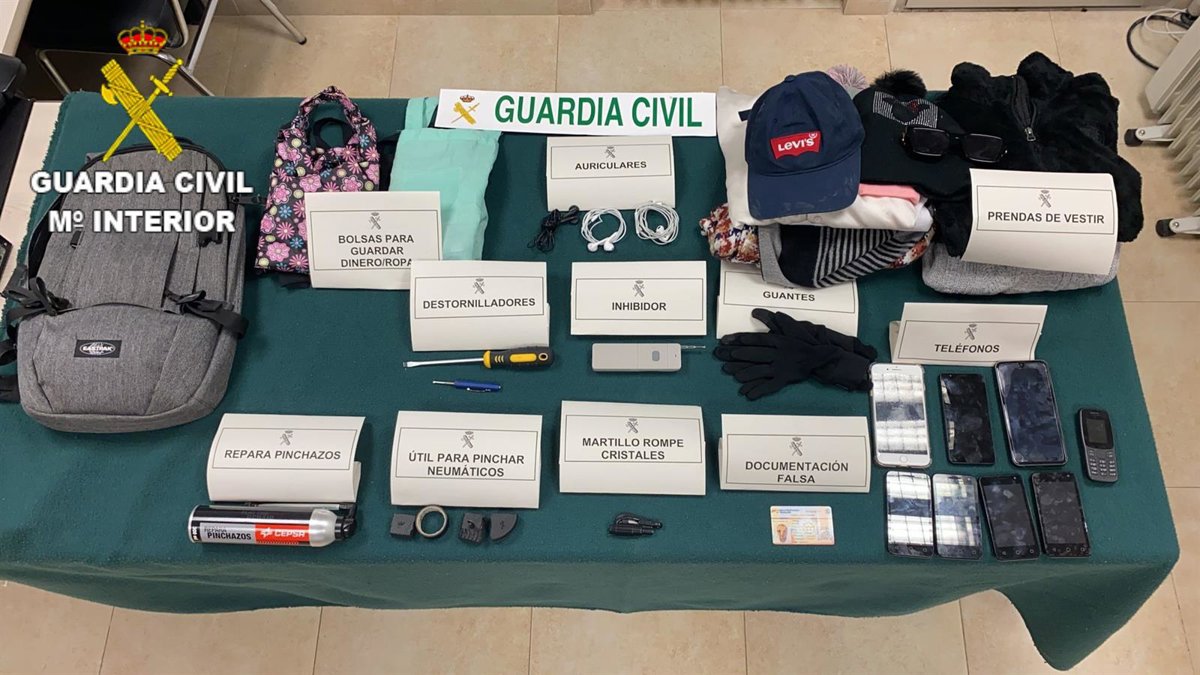 Por estos hechos, los guardias civiles identificaron a los cuatro individuos, dos hombre y dos mujeres, comprobando como todos ellos se encontraban conectados mediante teléfonos móviles, de igual forma se procedió a una inspección superficial de las pertenencias que llevaban, hallando diverso material utilizado de forma habitual para la comisión de este tipo de hurtos (dispositivo inhibidor de frecuencias, un útil para fracturar cristales de las ventanillas de vehículos, un objeto punzante que podría servir para pinchar las ruedas de los coches, así como gran cantidad de ropa).
