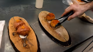El Restaurante Coctelería toledano 'Barrio' celebra el Día Mundial de la Croqueta este martes, 16 de enero, con dos modalidades propuestas en su carta. La primera es de jamón ibérico acompañada con polvo de tomate y salsa de huevo frito y otra de kimchi de salmón y curry rojo, servida con brotes de col morada y salsa de wasabi y lima.