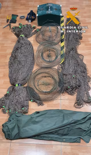 En el lugar donde se encontraba oculta esta persona se ha intervenido diverso material de trampeo de las piezas cinegéticas, como 24 redes, tres nasas metálicas, una navaja, unos alicates, un anillo de cableado de acero, un set de gomas de trampeo, una linterna de cabeza y un cajetín de madera donde guardaba dos hurones.