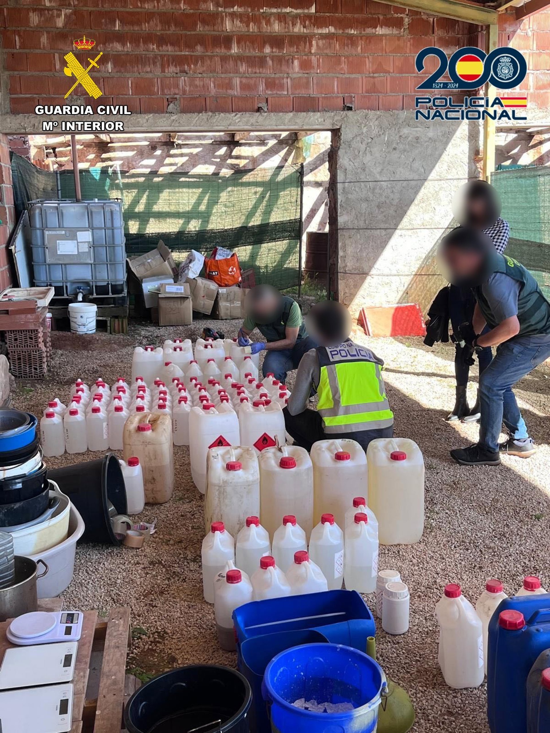 Entre estos registros se encontraban los dos laboratorios, uno situado en la localidad de Montiel (Ciudad Real) y otro en Fuengirola (Málaga) en cuyo interior encontraron grandes cantidades de precursores listos para ser utilizados en el proceso de transformación de la droga. Así mismo, se hallaron más de dos toneladas de carbón vegetal, del cual ya habían extraído la sustancia estupefaciente.