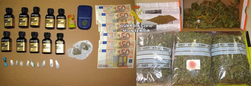 Como resultado de las mismas, en un establecimiento público de la localidad de La Solana, uno de los ahora detenidos tiro un bote de plástico al suelo, por lo que ante esta situación y su nerviosismo, se procedió a su cacheo interviniéndosele dos botes de popper, 0,5 gramos de speed, dos gramos de marihuana, cuatro gramos de MDMA, así como 100 euros, procedentes de la venta de las sustancias estupefacientes.