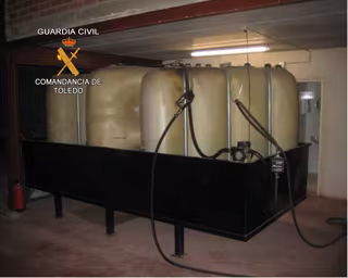 Los agentes, tras requerir al titular de la empresa para que permitiera inspeccionar la nave aledaña, sin que éste pusiera impedimento alguno, localizaron un depósito artesanal y dividido en tres compartimentos, con una capacidad total de 6.000 litros, que contaba con una bomba eléctrica y un boquilla metálica para el repostaje de los camiones.