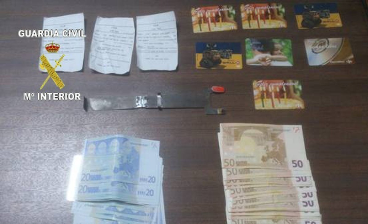La Guardia Civil estableció un operativo encaminado a detener al autor del hecho en el que contó con la cooperación de la Policía Local, cuyos efectivos identificaron a una persona que trataba de huir del lugar portando siete tarjetas de un conocido centro comercial, utilizadas para defraudar al cajero automático y 1.880 euros en metálico, así como tres resguardos de operaciones realizadas en otros tantos cajeros automáticos.