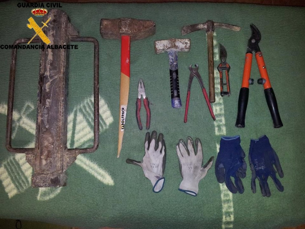 Se han intervenido del interior del vehículo en el que viajaban los cuatro detenidos diversos efectos y herramientas, supuestamente utilizados por estos para la comisión de hechos delictivos, en concreto dos martillos, un pico de mano, dos tijeras de las utilizadas para la poda, unas tenazas, unos alicates, dos pares de guantes de trabajo y un ariete.