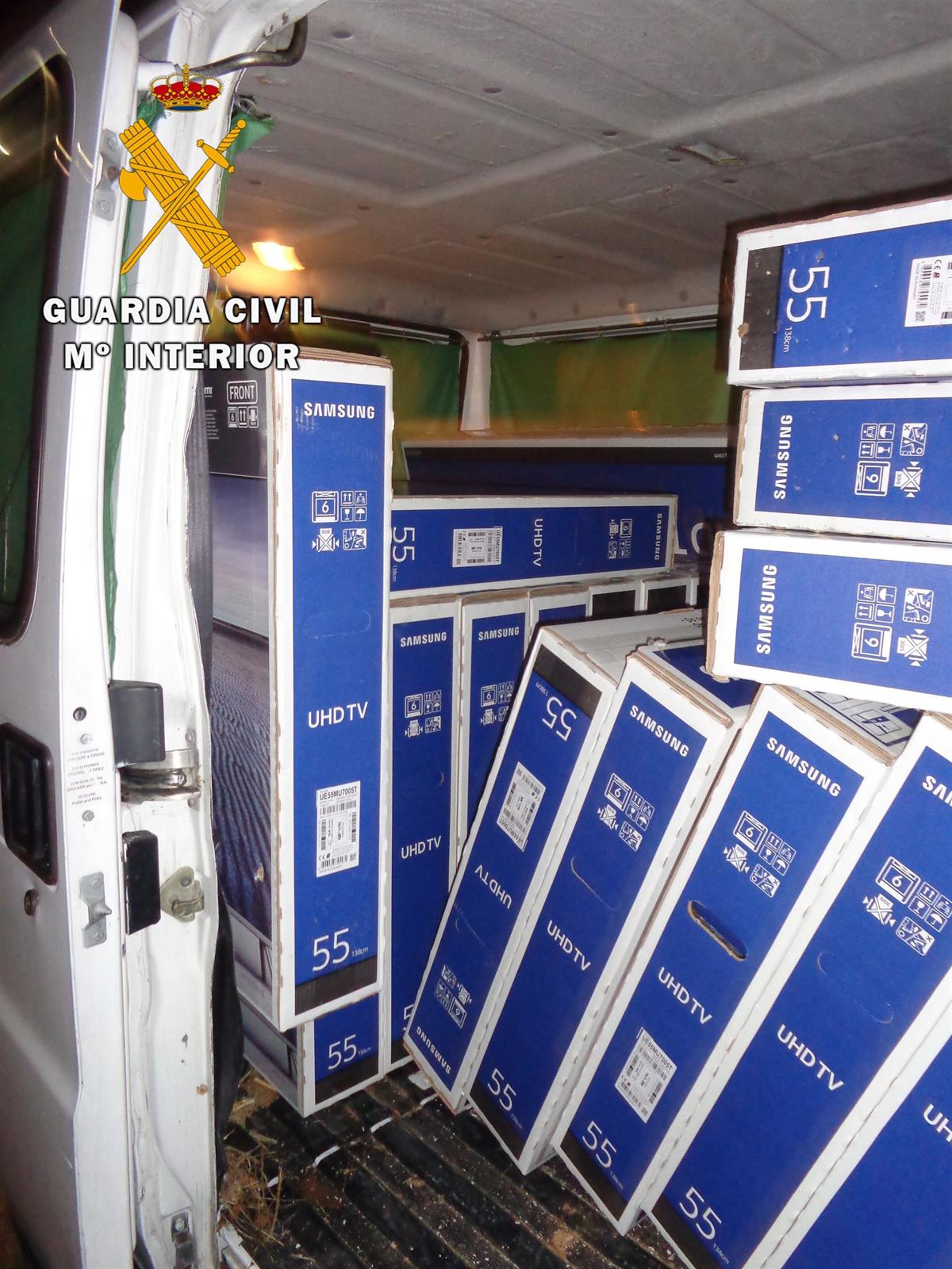 La Guardia Civil comprobó que la furgoneta, donde estos hombres ya habían cargado 21 televisores, había sido sustraída el pasado mes de noviembre en la localidad de Madrid, por lo que se procedió a la recuperación de la carga y del vehículo.